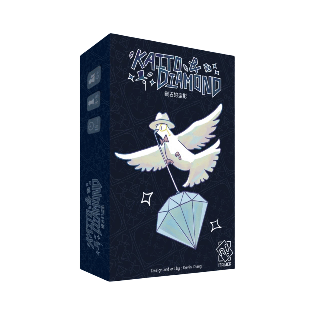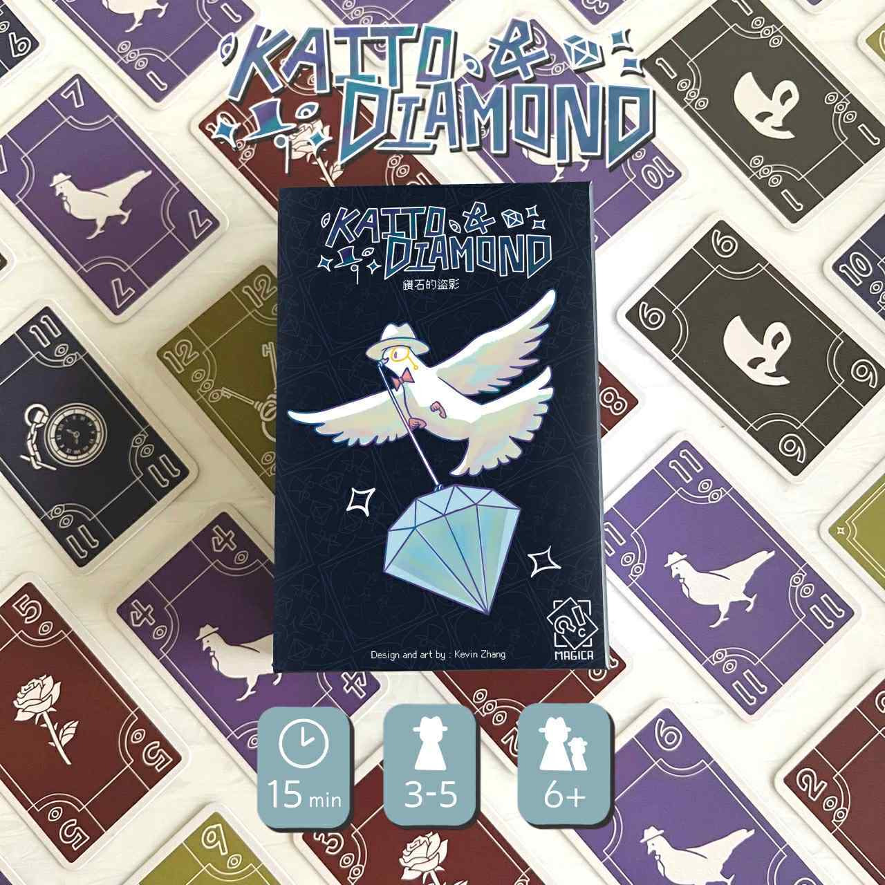 Kaito & Diamond is a trick-taking game where every player takes on the role of a daring Kaito, competing to steal valuable diamonds each round. The player who plays the highest-valued card wins the diamond, but also catches the attention of the guard.